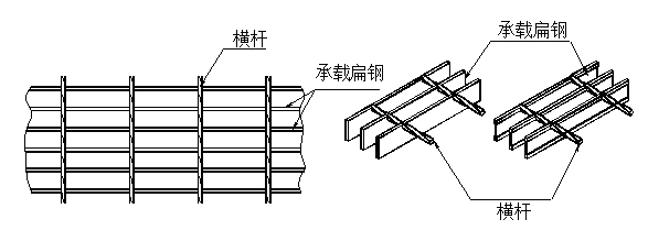 在承载扁钢和横杆的每个交点处,通过压力将横杆压入承载扁钢或预先开好槽的承载扁钢中,将其固定的钢格板,称为压锁钢格板。压锁钢格板的横杆通常采用扁钢。如图2所示: