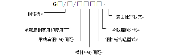3.1 钢格板的型号,根据承载扁钢规格、承载扁钢与横杆组合间距、钢格板结构型式、承载扁钢外形,以及表面处理状态等不同,形成多种规格,型号表示方法如下: