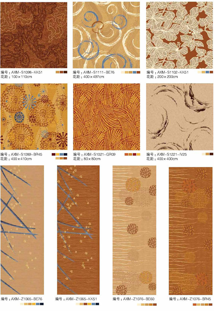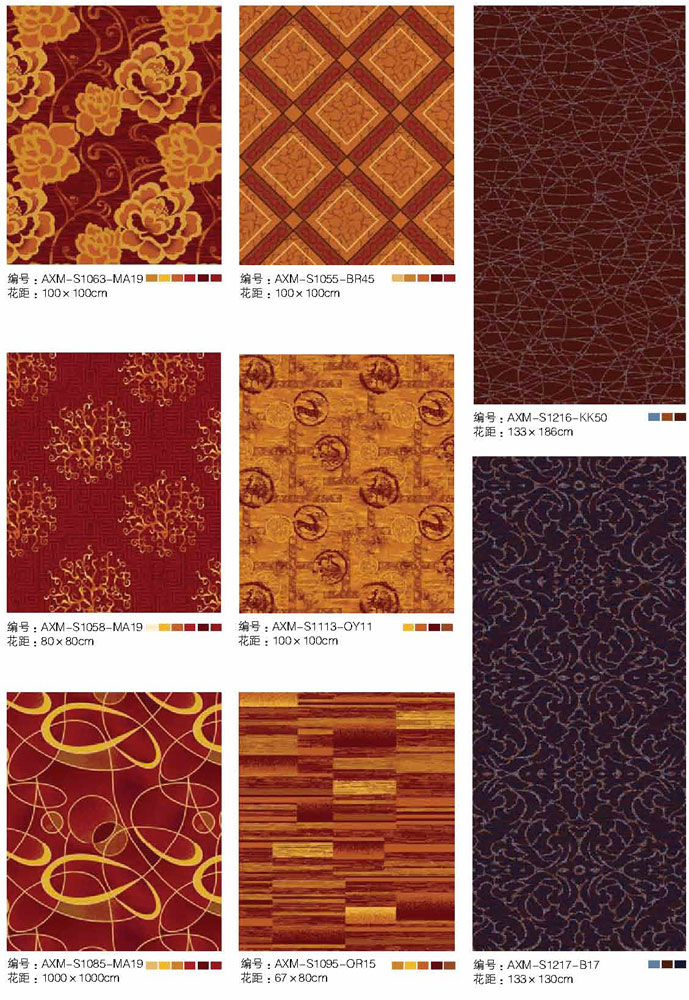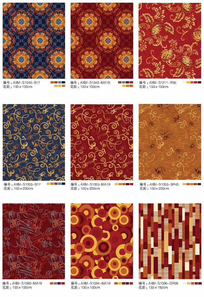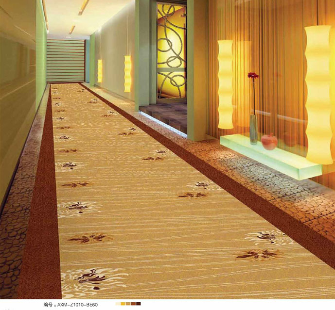阿克明地毯毯面平整、丰满,风格富丽堂皇,达到国际商业重量级地毯标准。具有卓越的外观保持性、耐用性、稳定性、舒适性,经久耐用。一般适用于酒店餐厅、走道、宴会厅、酒吧、会议室等公共场所。