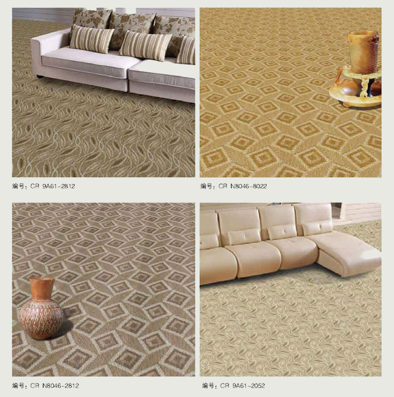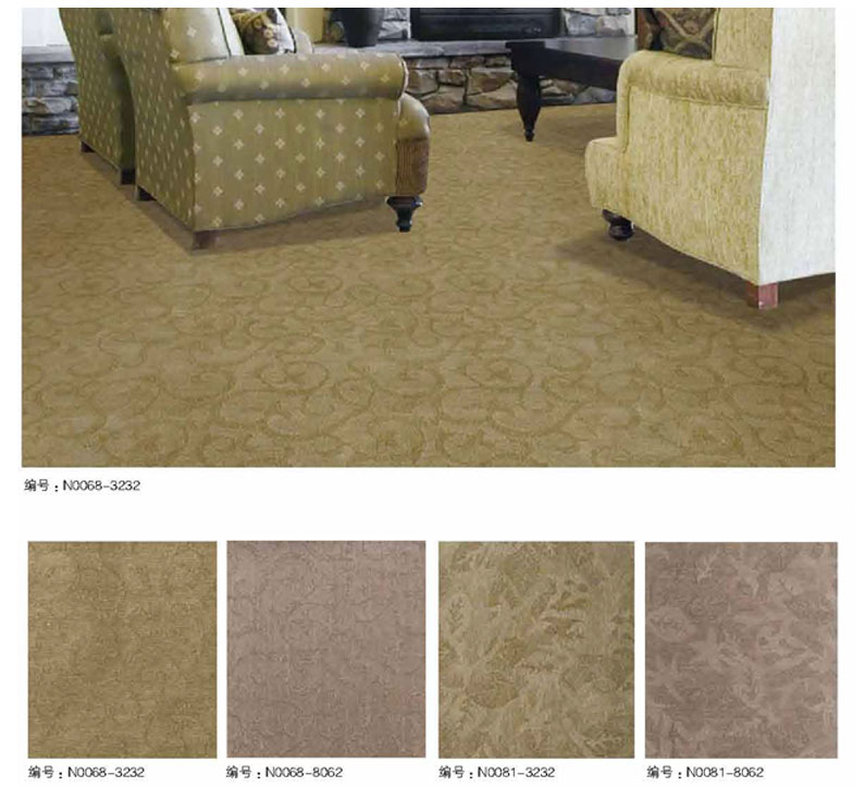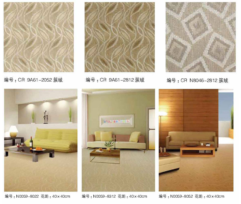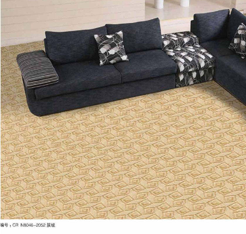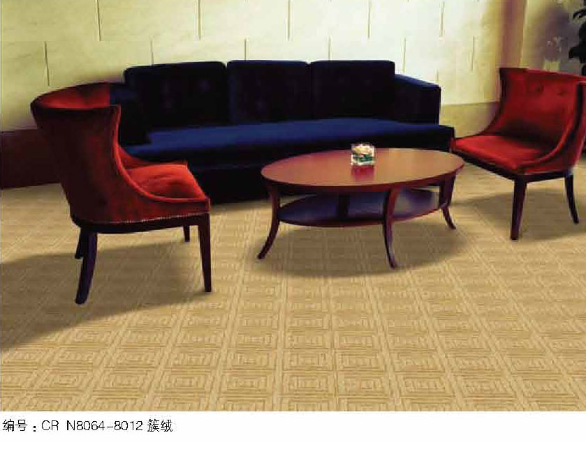 簇绒地毯图案新颖多变、颜色典雅高贵,拥有三层不同绒高的全圈或圈割结合图案,极具浮雕感觉,装饰效果极佳。适用于铺设在高档酒店、办公、轮船等。