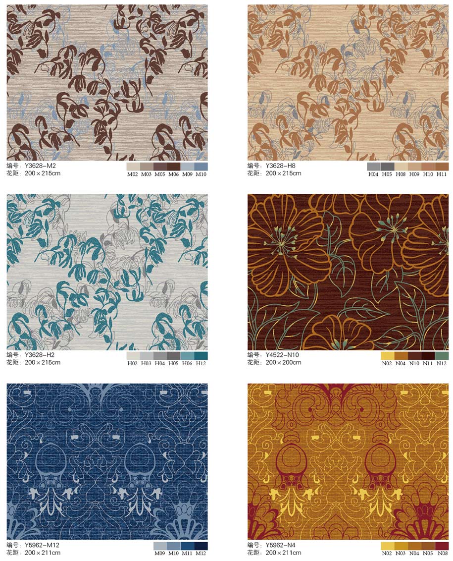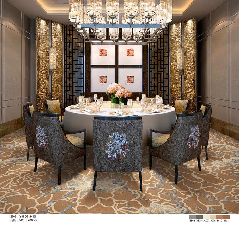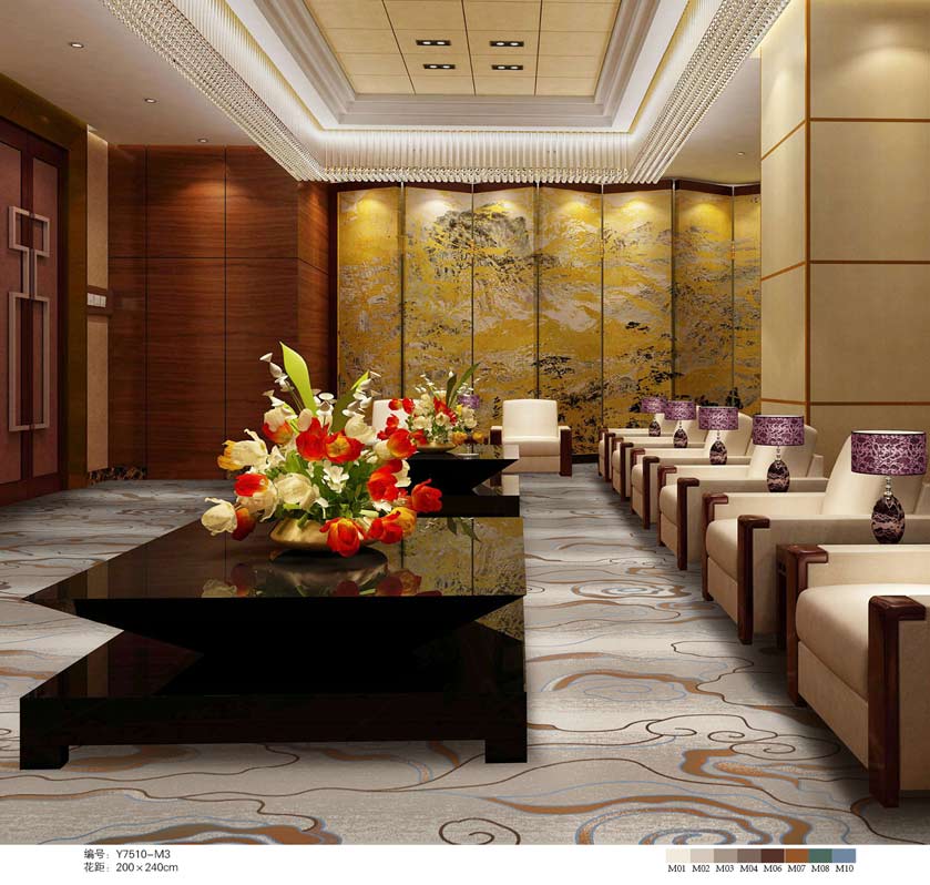 印花地毯以尼龙为原料,具备地毯弹性好、色牢度高、防霉、防虫蛀等特点。适用于各大酒店会议厅、餐厅、咖啡厅等公共区域,并可用于客房、办公室等场所。