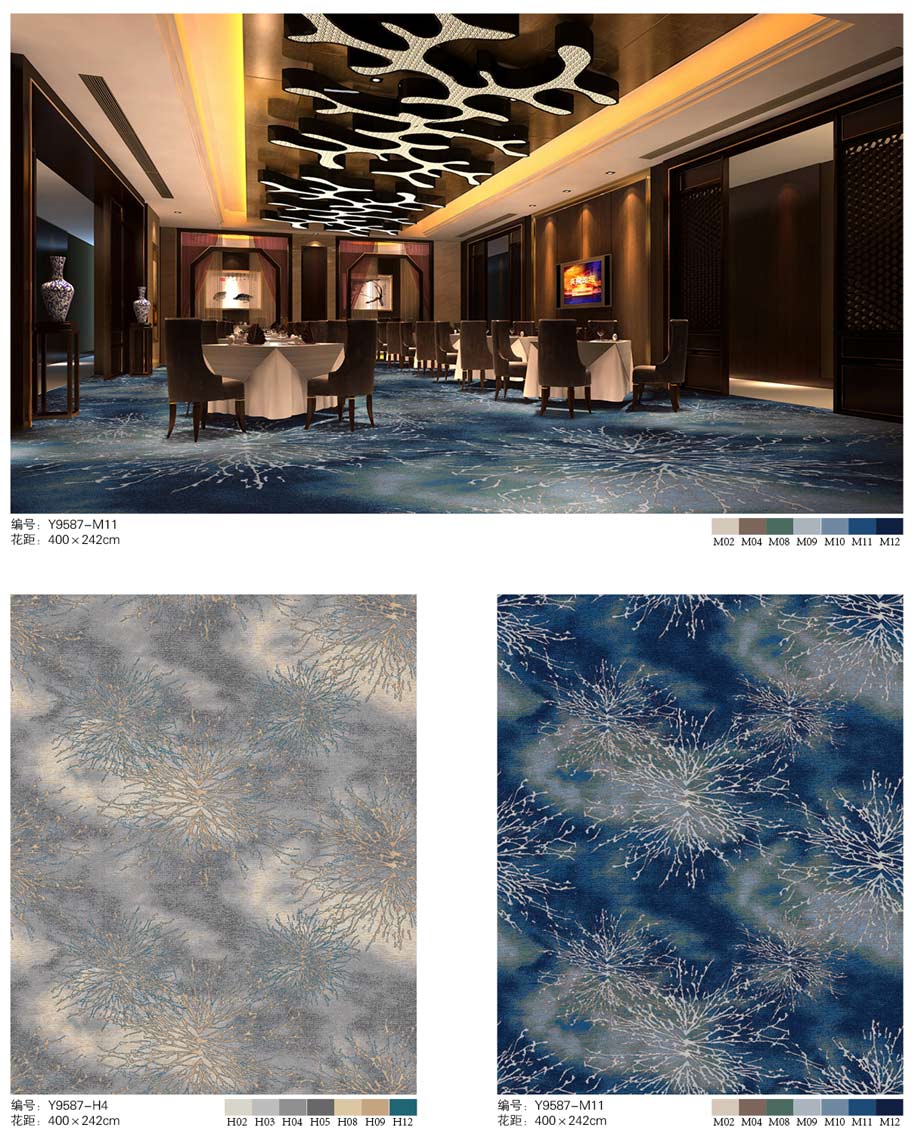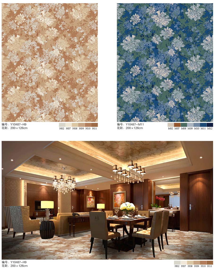 印花地毯以尼龙为原料,具备地毯弹性好、色牢度高、防霉、防虫蛀等特点。适用于各大酒店会议厅、餐厅、咖啡厅等公共区域,并可用于客房、办公室等场所。
