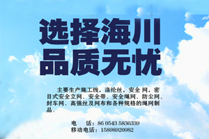 山东滨州海川绳网厂,位于济南至滨州市220国道中段,与新建滨博黄河大桥交汇的李庄镇工业园。李庄镇生产绳网已有三百多年的历史,被誉为绳网之乡,其交通便利,经济发展迅速,绳、网、安全带及化纤制品规格齐全。 主要生产施工线,涤纶丝,安全网,密目式安全立网、安全带、安全绳网、防尘网、封车网、高强丝及网布和各种规格的绳网制品。 连年被评为市级“重合同、守信誉”企业,消费者满意单位,私营经济明星企业。公司产品现畅销北京、上海、天津、重庆、济南、昆明、成都、南宁、乌鲁木齐、西安、武汉、南京、青岛、潍坊等全国各大中城市,公司设有办事机构多处,质量信誉反馈及时,市场需求信息准确,消费都适应得度。公司也一直重视着产品的质量。公司总经理邢光英携全体员工热忱欢迎新老客户来公司洽谈业本公司愿与各界朋友精诚合作,互利共赢。