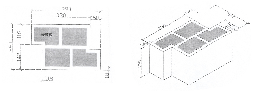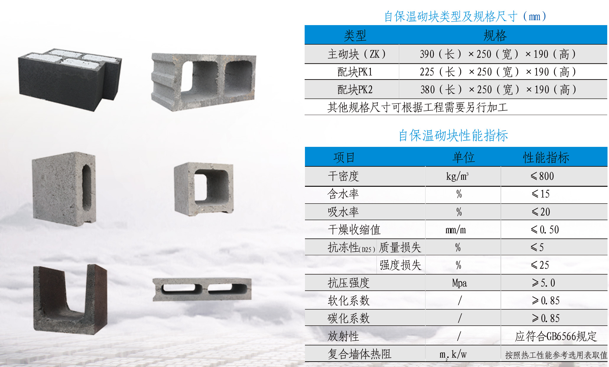 以水泥为胶结料,煤渣、珍珠岩等为主要材料,加适量掺合料、外加剂,用水搅拌经机械震动压制成双排孔轻集料混凝土空心砌块,空腔中填充聚苯板(EPS),并在两排孔中间设置12mm宽长孔,砌筑后形成静止空气层,由此形成的集建筑围护与保温功能于一体的混凝土砌块,以下简称自保温砌块。