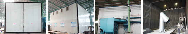 室体外壁为岩棉复合保温板,室体以型钢为骨架,并使用型材进行斜撑加强;室内四周铺5mm耐磨橡胶板。室体两侧设有对开式大门,室体设有一件安全门,并在安全门上设备直径300mm的观察窗,观察窗使用6mm的钢化玻璃,以方便观察室内状况。顶部设有进风百页窗,并配有消声装置。
