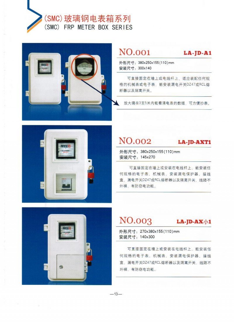 玻璃钢SMC电表箱可分为:1表位、2表位、3表位、4表位、6表位、8表位、9表位、12表位玻璃钢电表箱、插卡(预费)式电表箱、插卡玻璃钢电表箱、IC卡玻璃钢电表箱、插卡表箱盖、表尾盖、透明表盖、变压器计量箱、插卡式玻璃钢电表箱(预付费电表箱)、SMC玻璃钢电表箱、电缆分线箱、楼层接线箱 、变压器防护罩。