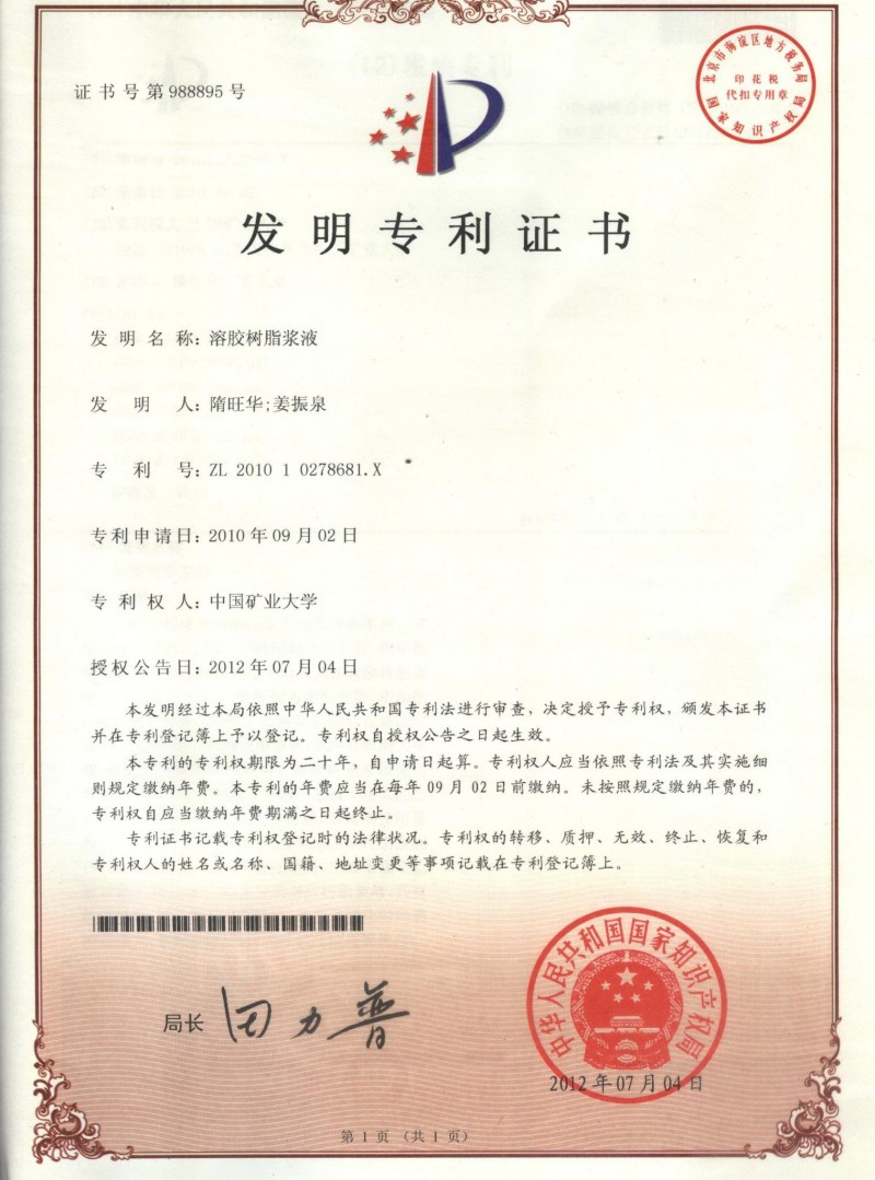 热烈祝贺我公司与中国矿业大学共同研制开发的ZK系列溶胶树脂,获得国家专利证书。