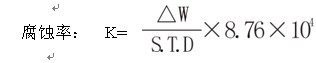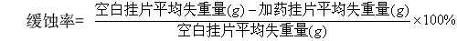6、缓蚀率测定:将打有编号的A3钢片6片(76.0×13.0×1.5mm)用石油醚洗三遍,再用无水乙醇洗一遍,用冷风吹干放入干燥器中后经30min称重(准 确到0.1mg),在两个1000ml广口玻璃瓶中分别入现场水,其中一个瓶不加缓蚀剂作空白,另一个加入50~100ppm缓蚀剂,每个瓶里用尼龙绳挂三片A3钢,塞紧瓶塞,然后放入50±2℃的电热恒温箱中,静态挂片7天,取出试片,用自来水冲洗干净,再用含有5%乌洛托品的15%HCI去除试片表面的腐蚀产物及垢物等,水洗后用无水乙醇脱水,冷风吹干后放入干燥器中,经30min后称重(准确到0.1mg),按下式计算缓蚀率和腐蚀率: