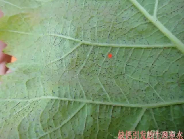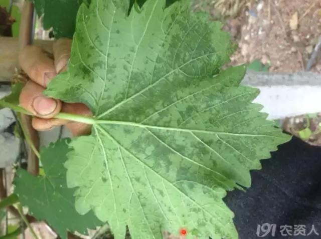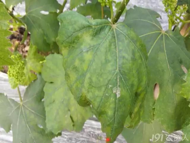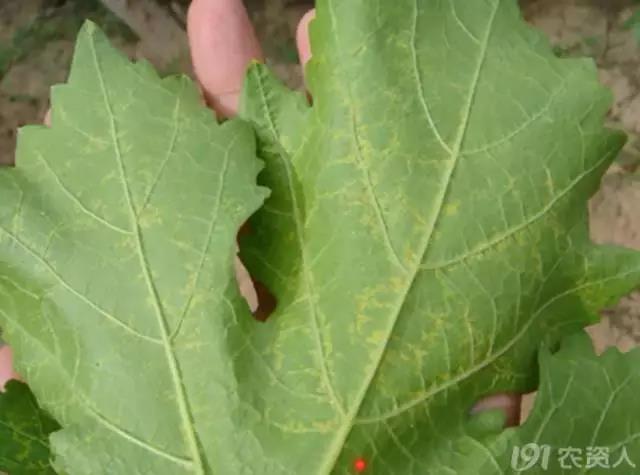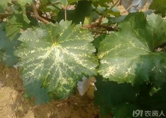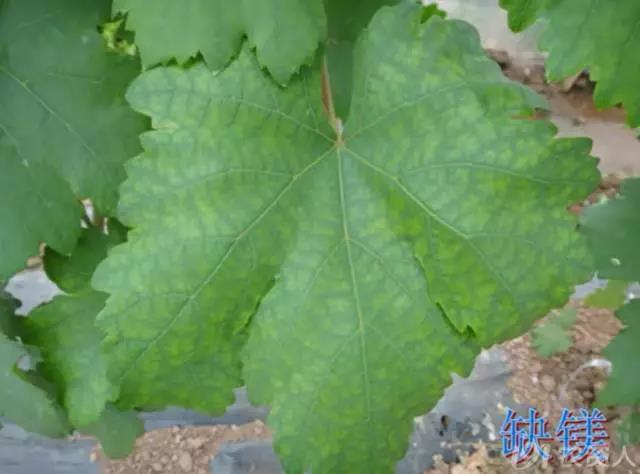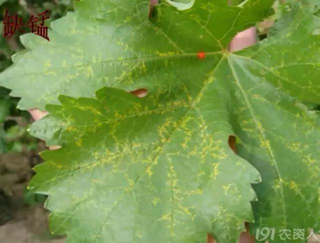 (缺锰症,新梢基部叶片变浅绿,接着叶脉间出现细小黄色斑点,并为最小的小脉所限。在开花前可以使用代森锰锌可湿性粉剂来改善。)