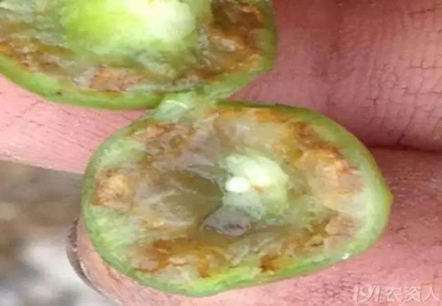 (缺硼和霜霉病区分:缺硼的果肉已经木质化,从种子周围发生;霜霉病果肉是黑褐色。上图全为缺硼。)