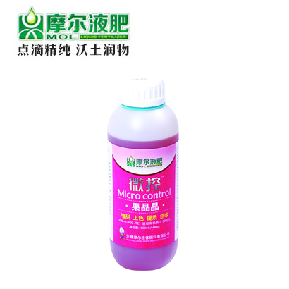 本品为高浓度有机钾制剂,澄清透明流体,氧化钾含量高达400g/L,速效有机质含量300g/L,特别添加高效助剂,吸收利用率极高,能快速满足作物膨大期、着色期及成熟期对钾的需求,使用后可促进果实内花青素及淀粉的合成,加速糖分的积累,果实转色快、着色匀、甜度高,上市提前,增产增收。