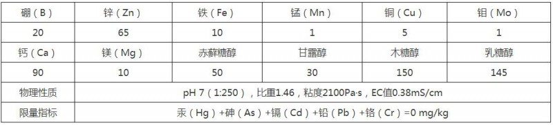 ★本品为高浓缩糖醇制剂,绿色清澈粘稠液体,富含作物生长必须的七种中微量元素,钙、镁、硼、锌、铁、锰、铜、钼协同作用,全面补充作物营养,及时满足作物需要;