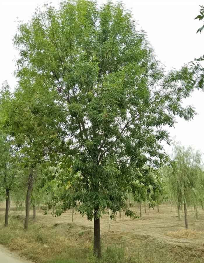 乔木,高达12米,冬芽卵圆形黑褐色,小枝灰褐色无毛或具黄色髯毛,有皮孔。奇数羽状复叶,对生,连叶柄长1520厘米。总叶轴中间具沟槽无毛,或于小叶柄之间有锈色簇毛。叶通常7片或7-9片,近革质,椭圆形或椭圆状卵形,长3.5-10厘米,宽1.7-5厘米,先端渐尖或钝。基部宽楔形,缘具不整齐锯齿或波状。表面淡绿色无毛,背面无毛或沿脉被短柔毛,中脉在表面凹下背面凸起,侧脉在表面不明显,背面略凸起,无柄或有短柄。圆锥花序侧生或顶生于当年生枝条上,长1015厘米疏松。总花梗无毛,花梗纤细长约5毫米,花萼钟状不规则分裂,无花瓣。雄蕊2枚花药,卵形或长圆状卵形,较花丝短,花柱棍棒状柱头。2裂翅果,倒披针形长2.8-3.5厘米,厚4-5毫米,先端尖钝或微凹,具种子1粒,花期4月,果期89月。