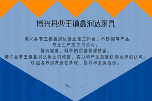 博兴县曹王镇鑫润达厨业是工作台、不锈钢等产品专业生产加工的公司,公司位于滨州市博兴县不锈钢厨具生产基地 拥有完整、科学的质量管理体系。博兴县曹王镇鑫润达厨业的诚信、实力和产品质量获得业界的认可。欢迎各界朋友莅临参观、指导和业务洽谈。